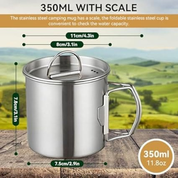 Stainless steel camping cup: the camping cup is made of stainless steel. Compared to other materials such as aluminium and titanium, the stainless steel material makes this mark cup very durable, sturdy and durable. The camp cup will not discolor or rust easily, and can be reused and not damaged. 350 ml with scale: the stainless steel camping mug has a scale, the foldable stainless steel cup is convenient to check the water capacity. The capacity of the camping mug is enough to meet the needs of most people. It can cook soup, coffee, tea, etc. under the Minghuo and the insulation effect is good. Lid and foldable handle: The camping cup with lid can prevent dust and impurities from entering the cup, prevents heat loss and is suitable for outdoor use. Wear the lid to prevent heat loss. The rounded corner edge is convenient to clean. The foldable wild camping mug has a foldable handle, does not take up space, and the built-in storage space is convenient for use. Application: camping cups are very suitable for camping, hiking, backpacking, backpacking, outdoor adventures and survival for cooking food, tea or coffee. The smooth design of the surface of the stainless steel cup can prevent the camping cup from hurting your hand and mouth in the event of an accident. Outdoor camping mug: camping mark mug with handle is very suitable for any ultra-light travel adventure, such as day hike, RV camping or paddle and backpacking. The handle of the water cup is convenient to save more space elsewhere. › See more product details