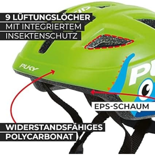 Helmet: Provide your children with optimal protection. Whether on the way to kindergarten, school, on trips or on the way home at dusk: the Puky PH 8 Pro-S is the perfect companion in terms of safety when cycling and cycling. PROTECTION: Play it safe. Additional protection and 360 degree visibility provide 4 reflector stickers. 9 ventilation holes with integrated insect protection ensure a cool head. Quality: trust in quality from Puky. The outer shell of the helmet is made of durable polycarbonate, which has been welded in the in-mould process to the inner shell made of EPS foam. SIZE: Rely on just the right protection. The Puky PH 8 Pro-S is suitable for a head circumference of 45-51 cm. The size is regulated via a padded plastic ring and a one-handed rotary adjustment system. DESIGN: Combine safety with fun. The Puky PH 8 Pro-S impresses with its cool look and makes the hearts of little monsters beat faster. At the same time, it is lightweight at 200 g. › See more product details