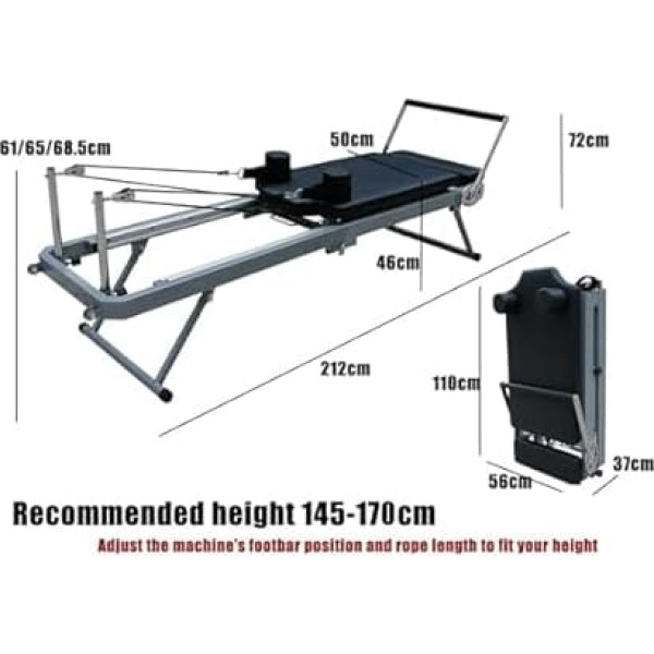 Made of thicker metal for durable support, with up to 135kg load capacity (Please note this is not the maximum weight of the user). Smooth sliding experience with improved aluminium slide rails and a thicker, more aesthetically pleasing seat cushion. 2. Convenient assembly and storage: Easy-to-follow manual for quick assembly. Foldable design for compact storage, with mobile wheels for easy transport in residential environments. 3. Raised platform for improved exercise: 18.1 inches from the slide bed to the floor, ideal for reducing sedentary habits and facilitating home training for the elderly. Recommended for people with a height of 145 cm to 170 cm who are looking for a basic training device. 4. Versatile workout options: Designed for versatility with various tension ropes and interchangeable sets. Adjust the rope weight for tailored workouts to different preferences and needs of women involved in home exercise routines. 5. Dedicated after-sales service: Prompt answers within 24 hours from our customer service team for any questions or concerns. › See more product details; Product description - Colour: Black. - Material: metal. - Product packaging size: 111.8 x 58.4 x 29.2 cm. - Product size (L x W x H): 213.0 x 57.0 x 90.0 cm. - Package weight: 35.2 kg. - Accessories included: baffle, square box, spring tube The Pilates reformer set includes everything you need for Pilates exercise. Enjoy easy storage and transport with the compact package size. Improve your Pilates studio practice with this versatile gear. Package includes: 1 x Pilates Yoga Bed Please note: 1:Actual product color may be slightly different due to monitor and light difference. 2:Please allow 1-3cm error due to manual measurement. Buy from us for a happy shopping experience!; Product description - Colour: Black. - Material: metal. - Product packaging size: 111.8 x 58.4 x 29.2 cm. - Product size (L x W x H): 213.0 x 57.0 x 90.0 cm. - Package weight: 35.2 kg. - Accessories included: baffle, square box, spring tube The Pilates reformer set includes everything you need for Pilates exercise. Enjoy easy storage and transport with the compact package size. Improve your Pilates studio practice with this versatile gear. Package includes: 1 x Pilates Yoga Bed Please note: 1:Actual product color may be slightly different due to monitor and light difference. 2:Please allow 1-3cm error due to manual measurement. Buy from us for a happy shopping experience!; - Colour: Black. - Material: metal. - Product packaging size: 111.8 x 58.4 x 29.2 cm. - Product size (L x W x H): 213.0 x 57.0 x 90.0 cm. - Package weight: 35.2 kg. - Accessories included: baffle, square box, spring tube The Pilates reformer set includes everything you need for Pilates exercise. Enjoy easy storage and transport with the compact package size. Improve your Pilates studio practice with this versatile gear. Package includes: 1 x Pilates Yoga Bed Please note: 1:Actual product color may be slightly different due to monitor and light difference. 2:Please allow 1-3cm error due to manual measurement. Buy from us for a happy shopping experience!