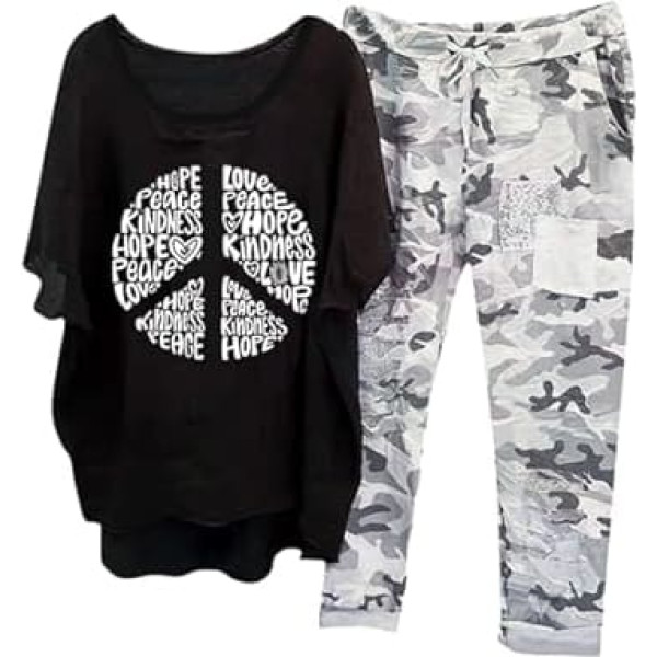 Briskorry Damen Set Zweiteiler, Kurzarm Tshirt und Lang Hose, Hosenanzüge Baggy Lässig Hausanzug Rundhalsausschnitt Kurzarm Sportanzug Luftige Leicht Musselin Set Gedrucktes Y2K Running