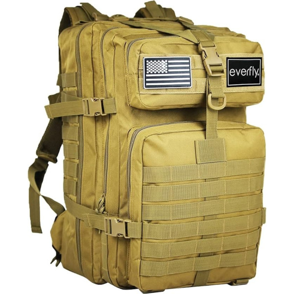 Everfly Backpack Men Women Military Tactical 45L - Backpack Crossfit Survival Hunting Fishing Hiking Backpack Gym Mountaineering Motorcycle - Oxford 800D - Molle Airsoft - 2 Patches, khaki