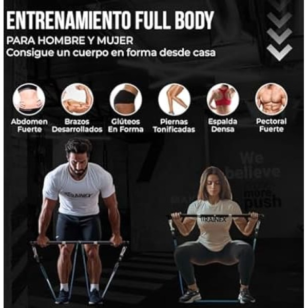 COMPLETE BODY WORKOUT WITH TRAINEX BAR - Create your home gym with our multifunctional bar. Perfect for any type of exercise you can imagine (squats, rowing, deadlifts, steps, chest roll, shoulder press...) Very high resistance with 6 bands (up to 100 kg) - Our set contains 6 heavy duty elastic muscle bands. Ideal for beginners and advanced users. Do an effective strength training and get a real fitness body! DEFINED ABS & ADDITIONAL ACCESSORIES Perform the best ab exercise with the abs wheels of the Trainex Bar. Also included is a door anchor, non-slip handles (for pulley lovers) and ankle straps ADJUSTABLE STRAPS FOR ALL HEIGHTS With 1.20m elastic bands and adjustable bar straps, our kit adapts to different heights and exercises. Our elastic muscle bands ensure that you don't miss a gym. PREMIUM QUALITY AND DURABILITY Made of 100% natural latex, our resistance bands combine elasticity and firmness, ensuring a long life and safety during every workout. › See more product details; Product description TRAINEX Bar + elastic bands for muscles: your home gym Looking for a workout anywhere without going to the gym? With our TRAINEX bar set, you can experience a full body workout at home. Ideal for varied exercises: from squats to military presses, create your fitness routine to ▶ Transfer all muscle groups. Use our elastic bands with TRAINEX Bar for multi-articular exercises such as squats, rowing, shoulder presses or deadlifts. With the door anchor and non-slip handles, you can have a pulley at home, ideal for chest exercises - with the ankle straps you can perform buttocks and leg exercises. Ideal for travel. Comes with a handy carry bag that allows you to take it anywhere. PACKAGE INCLUDES - 6 elastic bands (2 x 20 lbs, +9 kg, blue); (2 x 40 lbs; +18 kg, green); (2 x 50 lbs, +22 kg, black) - 1 x Trainex BAR - 2 x abdominal rollers - 1 x mini kneeling mat - 1 x door anchor. 2 x Touch Straps Billos - 2 x Anti-slip Handles - 4 x Carabiner Hooks - Carry Bag - Training Guide - Your satisfaction comes first At TRAINEX we take it very seriously to create high-quality and durable products. The TRAINEX bar is made of high-quality materials. If your bands break, write to us and we will be happy to change them to you.\; Product description TRAINEX Bar + elastic bands for muscles: your home gym Looking for a workout anywhere without going to the gym? With our TRAINEX bar set, you can experience a full body workout at home. Ideal for varied exercises: from squats to military presses, create your fitness routine to ▶ Transfer all muscle groups. Use our elastic bands with TRAINEX Bar for multi-articular exercises such as squats, rowing, shoulder presses or deadlifts. With the door anchor and non-slip handles, you can have a pulley at home, ideal for chest exercises - with the ankle straps you can perform buttocks and leg exercises. Ideal for travel. Comes with a handy carry bag that allows you to take it anywhere. PACKAGE INCLUDES - 6 elastic bands (2 x 20 lbs, +9 kg, blue); (2 x 40 lbs; +18 kg, green); (2 x 50 lbs, +22 kg, black) - 1 x Trainex BAR - 2 x abdominal rollers - 1 x mini kneeling mat - 1 x door anchor. 2 x Touch Straps Billos - 2 x Anti-slip Handles - 4 x Carabiner Hooks - Carry Bag - Training Guide - Your satisfaction comes first At TRAINEX we take it very seriously to create high-quality and durable products. The TRAINEX bar is made of high-quality materials. If your bands break, write to us and we will be happy to change them to you.\; TRAINEX Bar + elastic bands for muscles: your home gym Looking for a workout anywhere without going to the gym? With our TRAINEX bar set, you can experience a full body workout at home. Ideal for varied exercises: from squats to military presses, create your fitness routine to ▶ Transfer all muscle groups. Use our elastic bands with TRAINEX Bar for multi-articular exercises such as squats, rowing, shoulder presses or deadlifts. With the door anchor and non-slip handles, you can have a pulley at home, ideal for chest exercises - with the ankle straps you can perform buttocks and leg exercises. Ideal for travel. Comes with a handy carry bag that allows you to take it anywhere. PACKAGE INCLUDES - 6 elastic bands (2 x 20 lbs, +9 kg, blue); (2 x 40 lbs; +18 kg, green); (2 x 50 lbs, +22 kg, black) - 1 x Trainex BAR - 2 x abdominal rollers - 1 x mini kneeling mat - 1 x door anchor. 2 x Touch Straps Billos - 2 x Anti-slip Handles - 4 x Carabiner Hooks - Carry Bag - Training Guide - Your satisfaction comes first At TRAINEX we take it very seriously to create high-quality and durable products. The TRAINEX bar is made of high-quality materials. If your bands break, write to us and we will be happy to change them to you.\