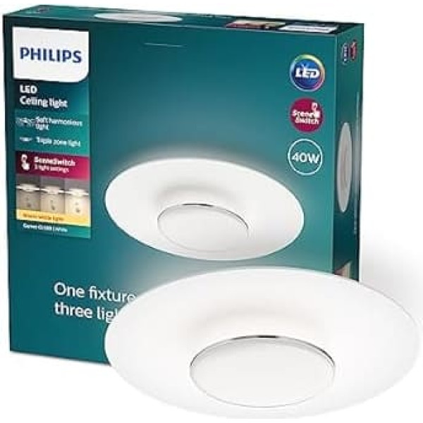 Three zone design: thanks to the combination of main light and linear edge light, the Garnet LED ceiling light can be selected between three light settings Warm white light: with a colour temperature of 2700 Kelvin and the two light sources, the ceiling lighting provides an individually adjustable atmosphere in the room SceneSwitch: SceneSwitch technology allows you to change the brightness of the two light rings without dimmer or installation with conventional wall switches Easy installation: the ceiling light in white is easy to mount on the ceiling and is ready to use immediately after connecting the plug With EyeComfort: thanks to the EyeComfort seal from Philips LED, the light offers comfortable light that is gentle on the eyes - for the right lighting in any situation This product is a surrounding product. Surrounding products are lights that can be disassembled for separate verification of the included light source(s) › See more product details
