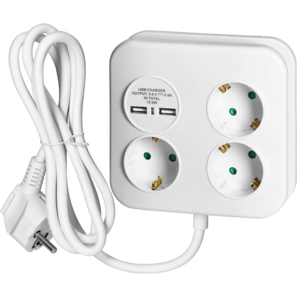 Kvadrātveida strāvas sloksne ar USB lādētāju 3x2P+Z (Schuko), 2xUSB-A, kabelis 3x1.5mm2, 1.4m