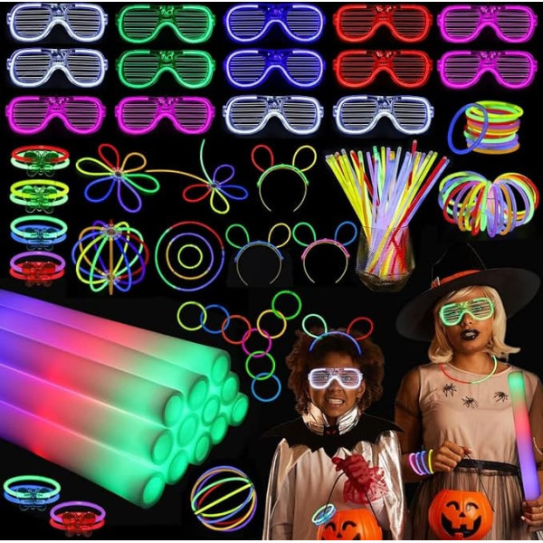 [Glow sticks party set]: party favour toys We offer 200 pieces glow sticks, 14 foam glow sticks, 14 LED luminous glasses, 215 connectors from which you can make handmade bracelets, necklaces, hair bands and other shapes to decorate your party. Offers you more choices and interactions with your family, children and friends [Neon party decoration]: our glow in the dark party toys are the best choice for party supplies and are suitable for various occasions, including: birthdays, graduations, weddings, concerts, outdoor camping, carnival, sporting events, Halloween, Christmas [Party favors for kids]: glow party toy foam glow sticks have three flashing modes: fast flashing, slow flashing, alternating flashing, with a duration of 6-8 hours, you can choose your favorite mode Red, blue, pink, green and white LED glasses, three flashing modes: fast flashing, slow flashing, normal light. Equipped with 200 light sticks with ports, you can DIY as you like and free your children Make the Party atmosphere more diverse and colourful [HIGH QUALITY AND SAFE]: We select our glowing toy parties made of high-quality plastics and materials that meet the highest safety and quality standards. We compare and test the different selected materials. We have selected the best products to test and optimise. With a light duration of 6-8 hours, we wish you a lot of fun celebrating all night Easy activation: with slight bending, the party glow sticks are activated. Shake the glow sticks large, so that the neon decoration lights up continuously and craft your party decoration with the connectors › See more product details