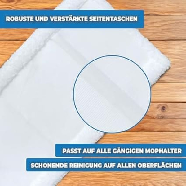 Ideal for streak-free cleaning of smooth and high-gloss floors. Mop cover is suitable for wet cleaning and dust wiping (dry cleaning) Dry cleaning: Lint, dust, dirt particles, hair are absorbed by the mop. Thanks to the soft material, the mops are also suitable for less hard floors The mop covers are suitable for the following floors: sealed wood, parquet, cork and linoleum floors as well as laminate, vinyl and PVC; high-gloss and soft plastic surfaces as well as plexiglass and acrylic; smooth tiles without or with very flat joints The mops are suitable for all standard folding holders in the household area (40 cm). The robust pockets ensure easy and quick insertion of the folding holder. The high suction and cleaning power of the fibres ensure a radiant cleaning result Washable up to 90 degrees, folding holder cover is suitable for tumble drying. Length: 40 cm, material: 100% polyester, as with all microfibres, please wash without fabric softener. Note: Be careful with particularly sensitive surfaces › See more product details; Product description 10 microfibre mops standard, white, 40 cm. Excellent value for money. Strong suction and cleaning properties. Ideal for thorough and streak-free wet cleaning of all smooth and high-gloss floor covering types (e.g. smooth tiles without or with flat joints). Suitable for many other floor coverings: sealed wood, parquet, cork and linoleum floors, laminate, vinyl and PVC. Also suitable for high-gloss and soft plastic surfaces (e.g. plexiglass and acrylic). Thanks to the soft and high-quality fibres, it is also practical for floor dusting. Robust pockets for easy and quick insertion of the folding holder. Selection of high-quality raw materials for optimal cleaning results. Length: 40 cm, suitable for tumble drying, washable up to 90 degrees, please wash microfibre without fabric softener.; Product description 10 microfibre mops standard, white, 40 cm. Excellent value for money. Strong suction and cleaning properties. Ideal for thorough and streak-free wet cleaning of all smooth and high-gloss floor covering types (e.g. smooth tiles without or with flat joints). Suitable for many other floor coverings: sealed wood, parquet, cork and linoleum floors, laminate, vinyl and PVC. Also suitable for high-gloss and soft plastic surfaces (e.g. plexiglass and acrylic). Thanks to the soft and high-quality fibres, it is also practical for floor dusting. Robust pockets for easy and quick insertion of the folding holder. Selection of high-quality raw materials for optimal cleaning results. Length: 40 cm, suitable for tumble drying, washable up to 90 degrees, please wash microfibre without fabric softener.; 10 microfibre mops standard, white, 40 cm. Excellent value for money. Strong suction and cleaning properties. Ideal for thorough and streak-free wet cleaning of all smooth and high-gloss floor covering types (e.g. smooth tiles without or with flat joints). Suitable for many other floor coverings: sealed wood, parquet, cork and linoleum floors, laminate, vinyl and PVC. Also suitable for high-gloss and soft plastic surfaces (e.g. plexiglass and acrylic). Thanks to the soft and high-quality fibres, it is also practical for floor dusting. Robust pockets for easy and quick insertion of the folding holder. Selection of high-quality raw materials for optimal cleaning results. Length: 40 cm, suitable for tumble drying, washable up to 90 degrees, please wash microfibre without fabric softener.