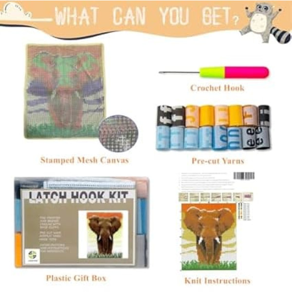 EMISTEM Latch Hook Sets for Adults - DIY Latch Hook Rug Sets for Kids, Crochet Kit for Beginners, Rug Making Kits with Printed Canvas, Gift Wrapping (Elephant, 15 x 21 Inch)