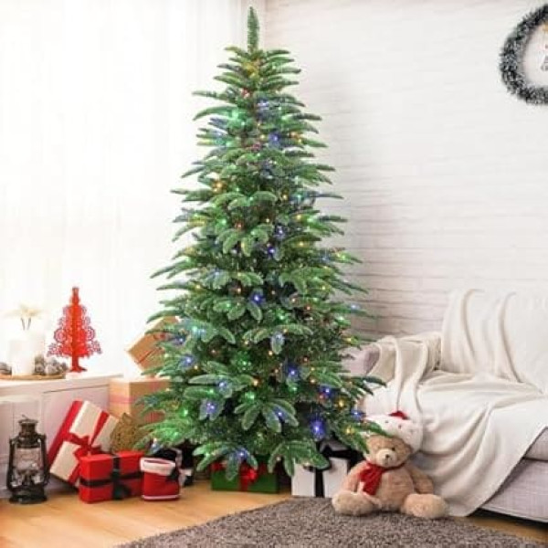 Dense and realistic branches: This 6 feet / 180 cm Christmas tree has 1045 branches so that it always looks thick, bushy, plump, real and natural. Besides, decorating this Christmas tree with ornaments and garlands can create a wonderful Christmas atmosphere for your home and garden. Pre-installed RGB light design: 380 pre-installed multi-coloured RGB lights with 8 light modes via remote control: 16 colours single colour continuous light/sparkle; 6 multi-coloured continuous light/twinkles; lights brighter/darker; light mode back/next; 8 classic modes; lights faster/slower; three timer types; time function off. Different lighting modes to choose from. Easy to assemble and disassemble: the tree consists of 3 different sections, complete with folding branches, so it can be easily assembled and dismantled and stored. The foldable metal base with 1 screw ensures stability, keeps your tree in height and prevents swaying and falling over. High-quality material: environmentally friendly, high-quality PE and PVC material, durable and fireproof, not only makes the trees look more real and fuller, but also improves the pressure resistance of the tree and is easy to store. Suitable for long-term use: the care of artificial Christmas trees is very simple, you don't have to worry about falling needles, watering or cleaning resin. Simply place the tree and add some decorations to easily create a festive atmosphere. › See more product details