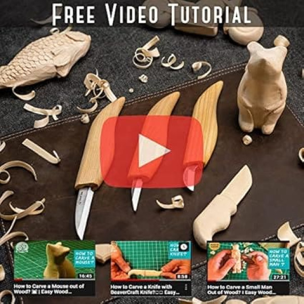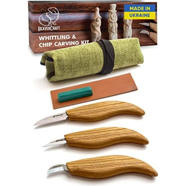 WOOD CARVING KIT FOR BEGINNERS AND KIDS This wood carving kit can help you start your carving career. It contains everything you need for carving: leather + polish, detail putty knife, cutting knife, roughing knife and a tool roll to store the instruments. WOOD CARVING KNIFE HANDLE The ergonomic shafts of these carving knives allow you to work many hours without feeling tired. The wood carving set has been specially designed for those who appreciate comfort when working with wood. WOOD CARVING TOOL SET RIGHT FROM PACKAGING These wood carving knives are manually pre-sharpened before packaging and are delivered directly to you by mail for immediate work. WOOD CARVING KIT FROM EUROPE: All BeaverCraft knives are made in Europe (Ukraine) so you get excellent quality of all your carving tools regardless of your skill level that you will really enjoy with. Carving Knife Woodworking Great Gift: Treat your fellow carver, beginner or child with this wood carving knife set; they will surely thank you with a great carving made with this set. WOOD CARVING KIT FOR BEGINNERS & KIDS Can't find a carving kit for kids to inspire them for a new hobbWith this wood carving set for children aged 8 to 12 years, your children can explore, learn woodwork such as toys, kitchen utensils, Christmas decorations and more, while having lots of fun. Such a carving knife set for children is a great gift for all beginners and younger carvers. › See more product details