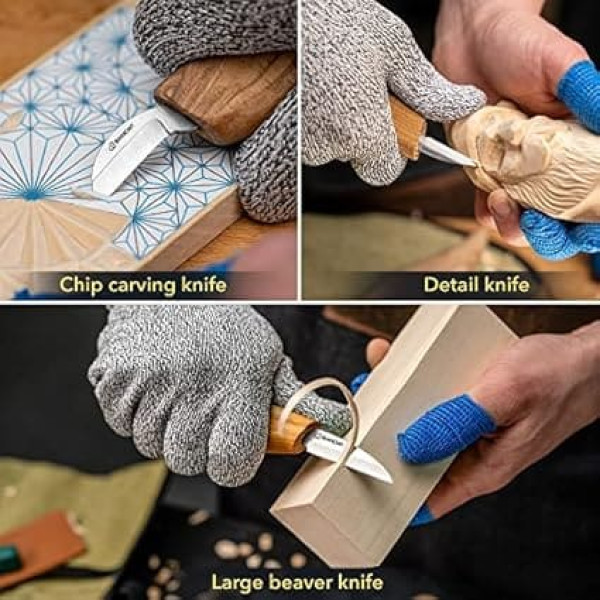 BeaverCraft Carving Knife Set S15 Wood Carving Tool for Children and Adults Wood Carving Set, Carving Knife Children - Carving Set with 3 Carving Knives, Leather Strop for Sharpening, Tool Bag