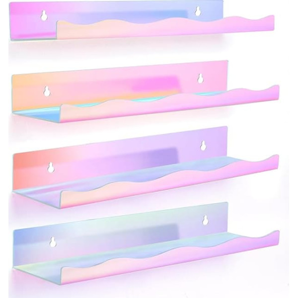 Stunning design – depending on the viewing angle, our dazzling, floating bookcase for the wall changes its colour. The scalloped front gives this unique shelf a playful look! Versatile acrylic shelf – our holographic floating shelf made of acrylic is perfect for toys, picture frames, books or as a vinyl record wall mount. It has a maximum load capacity of 2.5 kg. Sufficient storage space – Our iridescent floating wall shelf measures 400 x 110 x 55 mm. Thanks to the 4 bedroom wall shelves included in the set, you have space for a variety of items and decorations. Durable – as our transparent bathroom wall shelf is made of high-quality and robust 3 mm thick acrylic, it does not chip or break easily. Mounting material included – practically we have included 8 dowels and 8 screws to this bathroom wall shelf set. You will also receive detailed and easy-to-follow assembly instructions (English language not guaranteed). › See more product details