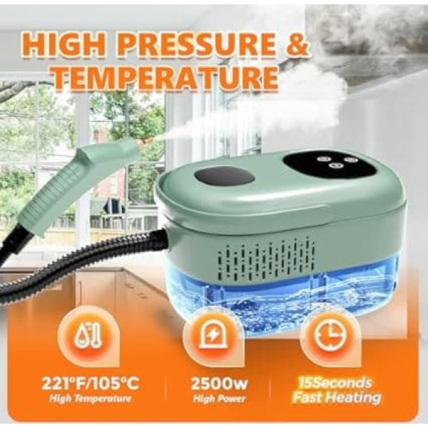 [Powerful Steam Cleaner] The high temperature pressure steam cleaner for cleaning uses a power of 2500W and can release 221℉/105℃ and 3bar high pressure steam within 15 seconds, which easily removes and removes stubborn greasy dirt, grime, dust and stains from a variety of surfaces. It helps you cope with daily cleaning tasks around the house and does not contain chemicals, harmful fumes or residue, making it a good helper for house cleaning. 6 levels of touch adjustment button: With the intelligent touch screen with 6 adjustment buttons, you can easily adjust the steam outlet and humidity of the hand steam cleaner by pressing the + or - button to achieve different steam water contents and meet your different cleaning needs. At the same time, the screen shows the use of the devices in real time. The settings of the steam cleaner for cleaning are easier to adjust than with a rotary knob. It is widely used in kitchens, bathrooms, furniture, cars, etc. [1100 ml water tank and portable] The portable steam cleaner for home use is equipped with a 1100 ml water tank, so you can focus on cleaning even away from the water source. It not only supports refilling water while working, but can also be used for half an hour after a single filling without the need to refill water frequently, which improves your cleaning efficiency. In addition, thanks to its compact design, the steam cleaner weighs only about 1.7 kg and is easy to transport to another cleaning location. [3 Different Brushes & Flexible] With 3 different brushes - steel brush, plastic brush and large plastic brush - the steam cleaner for multiple surfaces can use different brushes according to the cleaning needs, which is convenient for removing greasy dirt, grime, dust and more suitable for stoves, kitchen, car, grout and tiles. In addition, the portable steam cleaner has a 2 m steam pipe, a 1.5 m long power cord and an extension tube that allows you to thoroughly clean crevices and corners, saving you work. MULTIPURPOSE STEAM CLEANER The car steam cleaner can help you cope with more cleaning tasks and is suitable for cleaning stoves, walls, microwaves, washing machines, refrigerators, bathrooms, kitchens, living rooms, hard floors, tiles, toys, upholstery, furniture, toilets, grills, windows, carpets, showers, sofas, cars, etc. [Accessories & Service] You will receive: 1 x steam cleaner with tank, 1 x 2m steam pipe, 1 x 1.5m power cord, 1 x extension tube, 2 x steel brush, 2 x plastic brush, 1 x large plastic brush, 1 x glove, 2 x waterproof ring and 1 x user manual. If you find parts are damaged after receiving a product, or if you have other questions, please feel free to contact us. We will get back to you within 24 hours. Note: 1. Each steam cleaner is tested before leaving the factory, so there may be water stains on the water inlet hose. 2. The spray gun has no control unit. If you want to stop steam operation, please turn off the power switch on the device body. 3. Please do not touch the metal nozzle, do not touch the steam and do not spray on people, pets or the device itself. 4. Also check the position of the seal to avoid air and water leaks. › See more product details