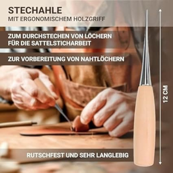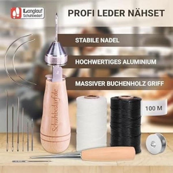 Incl. Detailed illustrated instructions (English language not guaranteed): from Langlauf Schuhbedarf shoemaker hand sewing machine with leather needles. Ideal for repairing tents, backpacks, sleeping bags, upholstery, saddles, bridles and much more. Leather processing made easy. Quality accessory leather tool set: incl. Replacement needle as well as an extensive needle assortment with 6 different needles and 1 roll (100 m) high-quality waxed leather yarn - leather sewing machine - tent yarn saddle awl hand sewing device - upholstery needles - professional saddle needle Leather tool made in Germany. Produced in Germany under the guidance of our high quality standards - leather hand stitcher thread sewing awl tool kit - leather tools - leather tools - leather working tool set Universal use: waxed yarn for sewing leather, thick fabrics, tarpaulins, foils, convertible roofs, LARP, COSPLAY .Sew heavy, thick material quickly and easily. Easy leather processing by hand sewing machine for leather The sewing tool set complements your bushcraft, outdoor and survival equipment with an important tool. Please also note our extensive range of leather and our high-quality sewing thread for leather in many colours. With the sewing needles for leather, tents and tarpaulin fabric, you have the perfect outdoor tool › See more product details; Product description Leather sewing made easy. With our extensive leather sewing kit equipped with high-quality products, you can perform (almost) all sewing work on leather. All products in the leather sewing set have been in our program for a long time and are used by many satisfied users in crafts and hobbies for leather sewing. With our hand sewing apparatus, specially designed for sewing leather, equipped with a comfortable beech wood handle, you can easily repair your shoes or sewing leather. The sewing book is a standard tool for leather craftsmen such as cobblers, shoemakers and saddlers. The practical and professional leather sewing tool for home and craftsmen, which should not be missing in any household. But not only leather can be processed with our sewing awl, tarpaulin fabrics, heavy linen and flag fabric can be sewn as well as convertible tops. The sewing awl comes ready to use with two high quality sewing needles, two bobbins and sewing thread. Of course, the set also comes with our easy-to-understand instruction manual (English language not guaranteed), so you can start sewing right away. With our sewing awl/sewing booklet, you can do small and larger sewing work on leather and heavy fabric quickly and permanently. Especially in hard-to-reach areas, e.g. When repairing a convertible top or awning, you will appreciate this useful sewing booklet. The sewing book is made from the best materials. The handle is made of beech wood from sustainable cultivation, chuck, screw and coil are made of stainless metal. The needles comply with the high craft standard and only high-quality, waxed sewing thread is used. A quality product that you will enjoy for a long time.; Product description Leather sewing made easy. With our extensive leather sewing kit equipped with high-quality products, you can perform (almost) all sewing work on leather. All products in the leather sewing set have been in our program for a long time and are used by many satisfied users in crafts and hobbies for leather sewing. With our hand sewing apparatus, specially designed for sewing leather, equipped with a comfortable beech wood handle, you can easily repair your shoes or sewing leather. The sewing book is a standard tool for leather craftsmen such as cobblers, shoemakers and saddlers. The practical and professional leather sewing tool for home and craftsmen, which should not be missing in any household. But not only leather can be processed with our sewing awl, tarpaulin fabrics, heavy linen and flag fabric can be sewn as well as convertible tops. The sewing awl comes ready to use with two high quality sewing needles, two bobbins and sewing thread. Of course, the set also comes with our easy-to-understand instruction manual (English language not guaranteed), so you can start sewing right away. With our sewing awl/sewing booklet, you can do small and larger sewing work on leather and heavy fabric quickly and permanently. Especially in hard-to-reach areas, e.g. When repairing a convertible top or awning, you will appreciate this useful sewing booklet. The sewing book is made from the best materials. The handle is made of beech wood from sustainable cultivation, chuck, screw and coil are made of stainless metal. The needles comply with the high craft standard and only high-quality, waxed sewing thread is used. A quality product that you will enjoy for a long time.; Leather sewing made easy. With our extensive leather sewing kit equipped with high-quality products, you can perform (almost) all sewing work on leather. All products in the leather sewing set have been in our program for a long time and are used by many satisfied users in crafts and hobbies for leather sewing. With our hand sewing apparatus, specially designed for sewing leather, equipped with a comfortable beech wood handle, you can easily repair your shoes or sewing leather. The sewing book is a standard tool for leather craftsmen such as cobblers, shoemakers and saddlers. The practical and professional leather sewing tool for home and craftsmen, which should not be missing in any household. But not only leather can be processed with our sewing awl, tarpaulin fabrics, heavy linen and flag fabric can be sewn as well as convertible tops. The sewing awl comes ready to use with two high quality sewing needles, two bobbins and sewing thread. Of course, the set also comes with our easy-to-understand instruction manual (English language not guaranteed), so you can start sewing right away. With our sewing awl/sewing booklet, you can do small and larger sewing work on leather and heavy fabric quickly and permanently. Especially in har