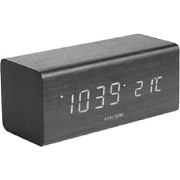 Dark Wood Block LED Alarm Clock – Black Measures 16.7 cm length by 2 cm width by 7 cm height. You can also choose whether you want to display the time permanently or make the time visible when the clock is typed or a sound sounds. Multiple options: displays time, date and temperature. 3 x AAA batteries (not included) › See more product details; Product description Karlsson Alarm clock LED KA5652BK; Product description Karlsson Alarm clock LED KA5652BK; Karlsson Alarm clock LED KA5652BK