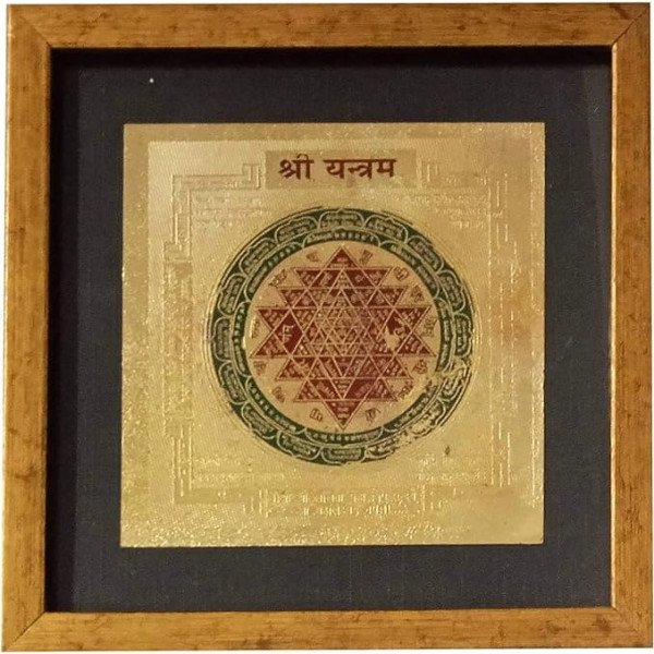 Shri Yantra encased in a designer frame Dimensions: frame: 5\; Product description This yantra is said to promote good luck and happiness for its This Yantra is in a vintage design frame for easy placement on any table or shelf. The frame also has a hook to use this piece as a wall hanging.; Product description This yantra is said to promote good luck and happiness for its This Yantra is in a vintage design frame for easy placement on any table or shelf. The frame also has a hook to use this piece as a wall hanging.; This yantra is said to promote good luck and happiness for its This Yantra is in a vintage design frame for easy placement on any table or shelf. The frame also has a hook to use this piece as a wall hanging.