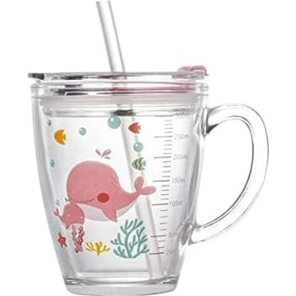 SIQITECH Milk Cup Children's Drinking Glass with Silicone Straw Glass Cup Lid Transparent Children's Glass Sealable 300 ml Measurable Water Cup Heat Resistant Portable Drinking Cup Animal Pattern Cute