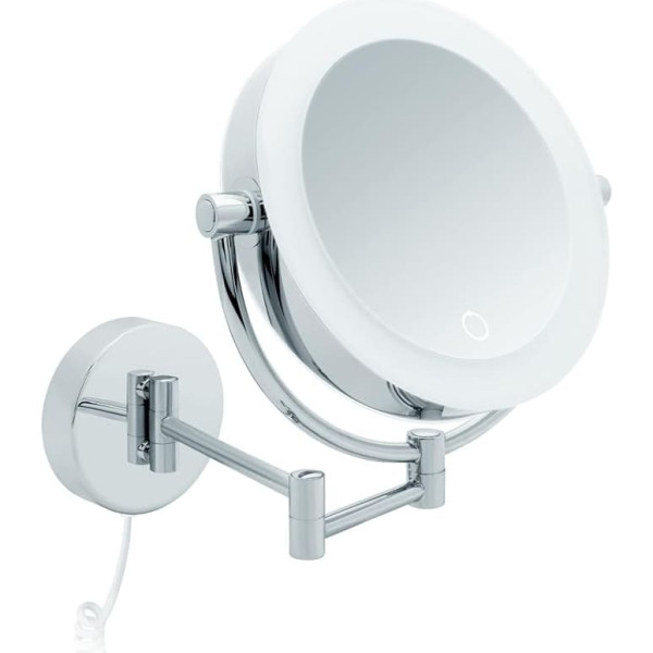 Extra large mirror surface – the mirror surface of our Tokyo beauty mirror is particularly large with a diameter of 18.5 cm. This ensures a good overview of all areas of your face and is ideal for make-up and shaving LED lighting: the bright LED daylight makes daily care easier even in low light conditions. With the dimmer function, you can adjust the brightness perfectly by touch. 510 lumens, 5,000 Kelvin and 12 watts provide good lighting Magnification: make-up mirror with 3x and 7x magnification. So you always have the right view for thorough facial care, shaving, plucking eyebrows, applying make-up, inserting contact lenses Extendible – The make-up mirror can be folded out twice and can be extended up to 32 cm. The mirror itself can be rotated and tilted 360 degrees for any desired position. After use, the mirror can be folded up to 8 cm on the wall to save space Material and dimensions – shiny chrome-plated metal, edge made of plastic, white plastic-coated cable 55 cm long up to 120 cm, extendible total height: 27 cm, width: 28 cm, depth: 8 cm folded and extendable up to 32 cm, mirror surface: diameter 18.5 cm › See more product details