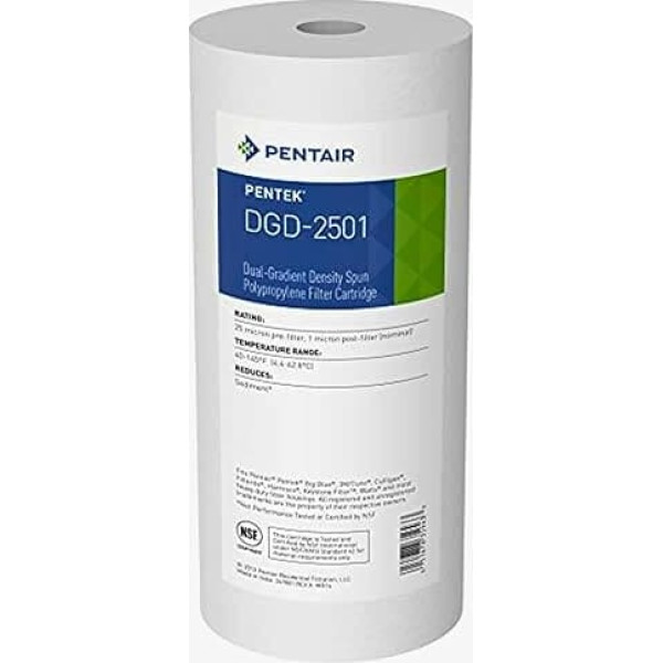 Keep your water clean and protect your devices by removing dirt, sand, mud and particles Fits all 10 inch blue or other heavy body and can replace any 10 x 4.5 inch sediment filter cartridge Achieves up to 3 times the dirt holding capacity compared to similarly sized sediment cartridges NSF Certified Replace every 6 months or if you notice a drop in water pressure or quality › See more product details; Product description Pentair Pentek DGD Series cartridges are made from 100% pure polypropylene and are suitable for use in Pentair Pentek Big Blue filter housings (and other heavy filter housings). DGD series cartridges are designed for purity and do not give off taste, odour or colour to the filtered liquid. In addition, the polypropylene construction provides superior chemical resistance and is not susceptible to bacterial attack. The advanced design of the DGD series combines selective final filtration with appropriate pre-filtration to provide up to three times the dirt holding capacity as similar size sediment cartridges and even more capacity than traditional spun or string-wound cartridges. The larger diameter of the filter reduces particle load so it can work at higher speeds. The effective filter depth is increased to a full 233%. This increased depth provides very high particle reduction efficiency and additional resilience. The design and performance features of the DGD series make it an excellent choice for all residential, agricultural, municipal and commercial applications.; Product description Pentair Pentek DGD Series cartridges are made from 100% pure polypropylene and are suitable for use in Pentair Pentek Big Blue filter housings (and other heavy filter housings). DGD series cartridges are designed for purity and do not give off taste, odour or colour to the filtered liquid. In addition, the polypropylene construction provides superior chemical resistance and is not susceptible to bacterial attack. The advanced design of the DGD series combines selective final filtration with appropriate pre-filtration to provide up to three times the dirt holding capacity as similar size sediment cartridges and even more capacity than traditional spun or string-wound cartridges. The larger diameter of the filter reduces particle load so it can work at higher speeds. The effective filter depth is increased to a full 233%. This increased depth provides very high particle reduction efficiency and additional resilience. The design and performance features of the DGD series make it an excellent choice for all residential, agricultural, municipal and commercial applications.; Pentair Pentek DGD Series cartridges are made from 100% pure polypropylene and are suitable for use in Pentair Pentek Big Blue filter housings (and other heavy filter housings). DGD series cartridges are designed for purity and do not give off taste, odour or colour to the filtered liquid. In addition, the polypropylene construction provides superior chemical resistance and is not susceptible to bacterial attack. The advanced design of the DGD series combines selective final filtration with appropriate pre-filtration to provide up to three times the dirt holding capacity as similar size sediment cartridges and even more capacity than traditional spun or string-wound cartridges. The larger diameter of the filter reduces particle load so it can work at higher speeds. The effective filter depth is increased to a full 233%. This increased depth provides very high particle reduction efficiency and additional resilience. The design and performance features of the DGD series make it an excellent choice for all residential, agricultural, municipal and commercial applications.