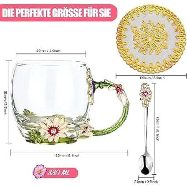 ✿ Handmade Enamel Glass Mug:This stunning flower tea cup is hand painted and inlaid, crafted with colorful diamond daisies, delicate and beautiful. Colorful enamel mug, strong and resistant to fading and color loss. ✿Durable and Safe: the coffee mug is made of high quality thickened lead-free glass material, environmentally friendly and heat resistant from 0 C to 100 C. The 330ml capacity is perfect for enjoying a cup of tea, coffee or juice in the morning or all day. ✿ PERSONALISED GIFT SET Our tea cup set includes: 1 x 330ml coffee mug, 1 x steel spoon, 1 x non-slip coaster, 1 x sunflower greeting card, 1 x cleaning cloth, 1 x exquisite packaging. Perfect gift for any occasion and once someone very special opens the prepared gift package, they will immediately fall in love with this enamel mug set Versatile use: Are you looking for a unique and thoughtful gift for her? Our handmade enamel glass tumbler is an excellent gift for women on birthday, Valentine's Day, Easter, Mother's Day, Christmas, New Year for your lovers, mom, dad, grandma, teacher, sister, daughter, colleagues and so on. You will fall in love with your extraordinary gift. ✿Satisfaction Guarantee:If you have any problems with your Homtibrm glass tumbler, you can contact us at any time. Ideal for enamel cups and glass mugs. › See more product details
