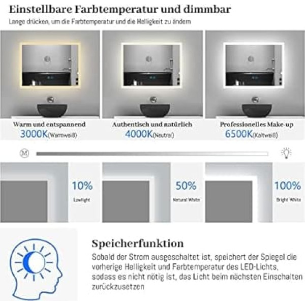 VERTICAL / HORIZONTAL MOUNTING - Finmrys bathroom mirror with LED lighting can be hung in two directions (50 x 60 cm or 60 x 50 cm). This exclusive bathroom mirror combines functionality and decorative design. It can serve as a room divider as well as an eye-catcher in the bathroom. The mirror comes fully assembled and installation is very simple. The matching expansion screws and screws are included in the box contents Bathroom mirror with dimmer for the perfect feel-good atmosphere: as the lighting needs are individually different, a bathroom mirror with integrated light colour changing function allows you not only to adjust the brightness, but also to change the light colour as needed (with memory function) FOG FREE LED MIRROR The mirror heating of the LED mirror is controlled independently of the lighting. By pressing the touch button before showering or bathing, the mirror heater can be switched on. This means that you always have a clear mirror image even after showering to apply make-up or styling directly This mirror can be controlled via wall switch or touch switch - To save energy and protect the environment, the control system has been updated: when the mirrors turn off, the lighting of the touch button is switched off. The touch switch has two buttons, one for anti-fog and one for lighting, so you can turn on the functions as needed. Safety and Guarantee This CE certified bathroom mirror with IP44 protection rating is waterproof and dustproof. Each LED mirror is packaged in a high quality reinforced cardboard box and stabilized with foam to ensure perfect condition upon delivery › See more product details