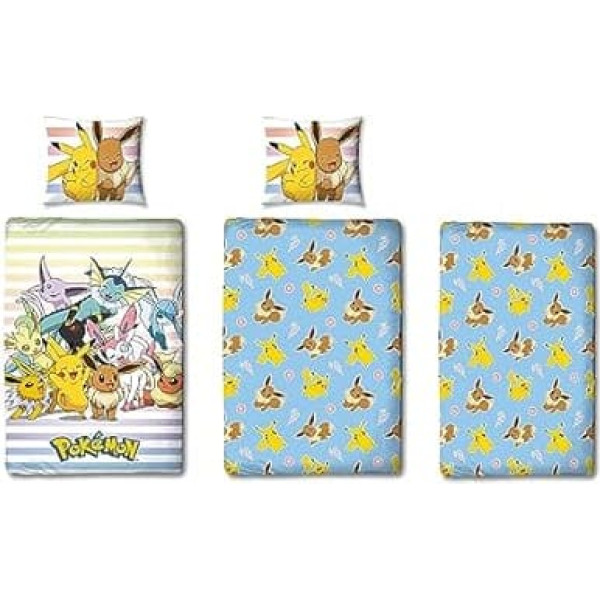 Motif: Front Pokemon motif Pikachu with Evoli and developments Aquana, Blitza, Flamara, Nachtara and others · Back and bed sheet with small Pikachu-s Evoli and lightning symbols · reversible bedding set 3 pieces Box contents: set of 3 consisting of pillow cover 80 x 80 cm + duvet cover 135 x 200 cm + fitted sheet 90 x 200 cm in German standard size Design: Pokemon Group Pickachu with friends · Popular anime bed linen with great colours green yellow pink purple blue colourful · Chill design also great for teenagers kids and adults · Beautiful children's bedding suitable for boys and girls · Cool boys bed linen youth bedding and adult bedding Quality: bed linen set made of 100% cotton, smooth renforcé / linen bed linen with zip on the duvet cover and pillow cover, all year round bed linen, washable at 60 degrees, suitable for tumble drying, Oeko-Tex Standard 100 certified Information: high-quality woven cotton for long-lasting comfort. Suitable for all Pokémon and Pikachu items and fan items such as cards, figures, sword games and battle go. Great gift idea for birthdays, Christmas or Easter. And as a cute decoration for the children's room › See more product details