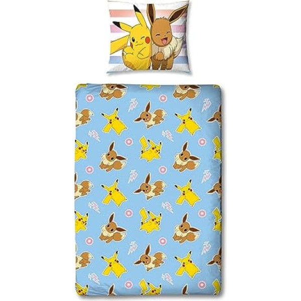 Pokemon 3-Piece Bed Linen Set 135 x 200 cm 80 x 80 cm with Fitted Sheet 90 x 200 cm Pokémon Pikachu Light Blue Children's Bed Linen 100% Cotton Linen with Zip