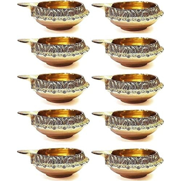 SATVIK Kuber Diya for Diwali Decoration Handmade Oil Lamp Golden Engraving Virgin Brass Metal Vilakku for Puja Pooja Traditional Indian Deepawali Housewarming Gift Item Pack of 10
