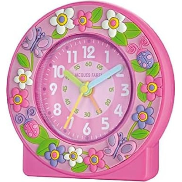 Brand: Jacques Farel Colour: pink Case Material: Plastic Movement Type: Quartz › See more product details; Product description pink plastic case with flowers, butterflies and beetles, securely bolted battery compartment, learning dial with minute markings and legible hours, hour and minute hands with label, quiet non-ticking quartz alarm clock, beep alarm, size 12 x 12 x 5 cm, weight 139 g, required battery: 1 x AA 1,5 V (not included); Product description pink plastic case with flowers, butterflies and beetles, securely bolted battery compartment, learning dial with minute markings and legible hours, hour and minute hands with label, quiet non-ticking quartz alarm clock, beep alarm, size 12 x 12 x 5 cm, weight 139 g, required battery: 1 x AA 1,5 V (not included); pink plastic case with flowers, butterflies and beetles, securely bolted battery compartment, learning dial with minute markings and legible hours, hour and minute hands with label, quiet non-ticking quartz alarm clock, beep alarm, size 12 x 12 x 5 cm, weight 139 g, required battery: 1 x AA 1,5 V (not included)
