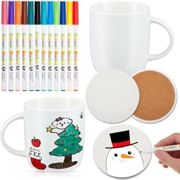 Complete DIY cup set: our ceramic mugs painting set contains 2 pieces white ceramic cups, 2 pieces blank ceramic coasters and 12 pieces colored painting pens, very creative and interesting; Enough quantity and combination can meet your creative needs Steps of use: first clean the surface of the cup or coaster with soap and water, and then let it dry completely. Then start painting with the colourful porcelain pens. After painting, do not touch the surface directly and do not come into contact with water. It is then heated in an oven to dry the paint. After cooling, you can use it. After drying, the inks are waterproof and dishwasher safe DIY fun: the cup craft set is not only a personal activity, it is a fun project, suitable for interaction between families and friends; you can make cups with your family and spend valuable time crafting together; In doing so, you can not only exercise your practical skills and creativity, but also improve your relationship with each other, relax your mood and create your own works of art Quality material: our coasters and mug for painting are made of ceramic, are safe, non-toxic and resistant to high temperatures; The coffee cups and coasters can be used together and are dishwasher safe, which makes cleaning easier after use; You can use this individual mug every day to drink water, drinks, coffee, etc.; It is suitable for home, office and other occasions Unique gift idea: you can paint special blessings or patterns on the DIY ceramic mug to make the gift personal and unforgettable, then give the homemade cups with handle to your family or friends as a birthday gift, party favor or Christmas gift, etc., showing your heart and creativity › See more product details; Product description Features: The adult craft set is both fun and practical. It not only provides ample space for creativity, but also promotes interaction between family and friends. Through DIY, you can integrate your creativity and emotions into your life and create unique works of art. The cups and ceramic coasters for crafts are suitable for a variety of occasions. They can not only be used at family reunions, dinners with friends, birthday parties and many other occasions, but also as a gift for family and friends, which is a good gift idea. Specifications: Material: ceramic. Colour: as shown in the picture. Dimensions: Cup: approx. 3.39 x 3.62 inches / 8.6 x 9.2 cm, bottom of the cup is approx. 7.2 cm. Coaster: approx. 10.3 cm in diameter Capacity of cup: 350ml Package includes: 2 x white cups. 2 x coasters. 12 x porcelain pens dishwasher safe. Notes: Please allow slight measurement errors due to manual measurement. The colour may vary slightly due to different monitor settings.; Product description Features: The adult craft set is both fun and practical. It not only provides ample space for creativity, but also promotes interaction between family and friends. Through DIY, you can integrate your creativity and emotions into your life and create unique works of art. The cups and ceramic coasters for crafts are suitable for a variety of occasions. They can not only be used at family reunions, dinners with friends, birthday parties and many other occasions, but also as a gift for family and friends, which is a good gift idea. Specifications: Material: ceramic. Colour: as shown in the picture. Dimensions: Cup: approx. 3.39 x 3.62 inches / 8.6 x 9.2 cm, bottom of the cup is approx. 7.2 cm. Coaster: approx. 10.3 cm in diameter Capacity of cup: 350ml Package includes: 2 x white cups. 2 x coasters. 12 x porcelain pens dishwasher safe. Notes: Please allow slight measurement errors due to manual measurement. The colour may vary slightly due to different monitor settings.; Features: The adult craft set is both fun and practical. It not only provides ample space for creativity, but also promotes interaction between family and friends. Through DIY, you can integrate your creativity and emotions into your life and create unique works of art. The cups and ceramic coasters for crafts are suitable for a variety of occasions. They can not only be used at family reunions, dinners with friends, birthday parties and many other occasions, but also as a gift for family and friends, which is a good gift idea. Specifications: Material: ceramic. Colour: as shown in the picture. Dimensions: Cup: approx. 3.39 x 3.62 inches / 8.6 x 9.2 cm, bottom of the cup is approx. 7.2 cm. Coaster: approx. 10.3 cm in diameter Capacity of cup: 350ml Package includes: 2 x white cups. 2 x coasters. 12 x porcelain pens dishwasher safe. Notes: Please allow slight measurement errors due to manual measurement. The colour may vary slightly due to different monitor settings.