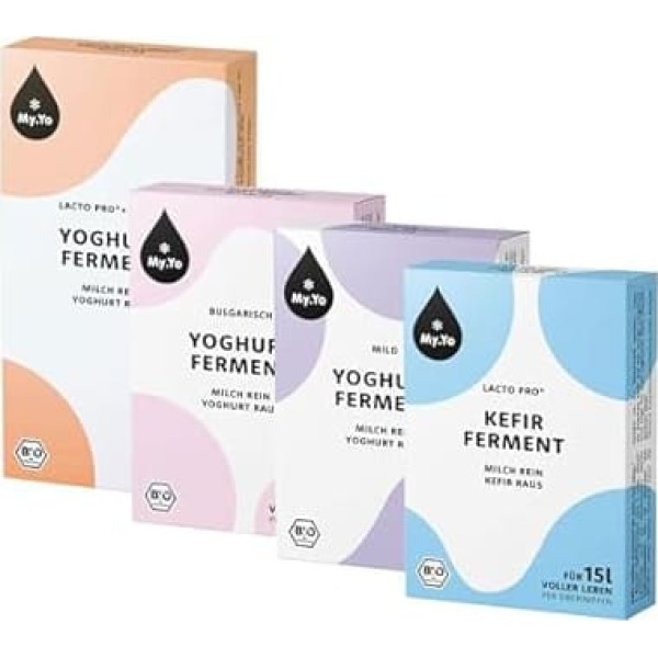 Set | The set of 4 offers variety and variety for your homemade yogurt. Contents: 1 pack. Lacto Pro + Inulin (3 x 25 g) Pack of 1. Bulgarian (3 x 5 g) 1 pack. Yoghurt ferment mild (3 x 5 g) 1 pack. Ferment for kefir (3 x 5 g) Made in Germany | For over 15 years, we have been producing organic yoghurt cultures according to DE-ÖKO-13, versatile for mild yoghurt in different varieties Natural: the yoghurt powder contains no artificial or animal additives and thus allows a 100% naturally mild yoghurt enjoyment. It is particularly low in calories, fat and cholesterol Versatile: for vegan yoghurt, the ferment can be used most easily with soy drinks, but also with cow H milk (1.5% or 3.5%) or lactose-free milk Sustainable: after 12-14 hours in the yoghurt maker, the yoghurt is ready and can be stored in the fridge for about 1 week, without the annoying plastic waste of conventional yoghurt cups › See more product details