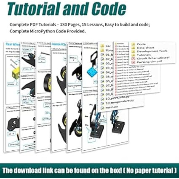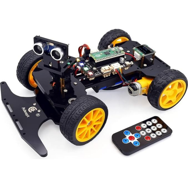 Note: This product (including the remote control) does not contain batteries and must be purchased separately by the user. This smart car kit is designed for teenagers to learn coding, building and programming. It is based on the Raspberry Pi Pico, using MicroPython as a programming language, the code is easy to read and easy to modify, it is the best choice for learning programming and robotics. EASY TO ASSEMBLE AND SET UP - Detailed tutorials (180 pages, 15 lessons) and full code are included. The download link is located on the map in the box (paper tutorials are NOT available as the tutorials are updated frequently). Various control methods - IR remote control, obstacle avoidance, line tracking, etc. The intelligent car uses servo motor to control the steering, which is closer to the mechanical structure of a real car. This kit comes with an ESP8266 Wi-Fi module, you can program to control this smart car via app. › See more product details; Product description Important tips: This kit is loose parts, you need to assemble it yourself. Lessons: 0001 Adjust the initial angle of the servo 0002 Assemble 001 Introduction Raspberry Pi Pico 002 About Pico Robot Expansion Board 003 Configure Pico Operating Environment 01 flashing LED. 02 Summer 03 servo motor 04 measure distance. 05 WS2812 RGB LED. 06 How to control a DC motor. 07 Line Tracking 08 Using IR receiver and IR remote control 09 OLED display. 10 Raspberry Pi Pico information 11 IR remote controlled car. 12 obstacle avoidance. 13 line tracking. 14 episodes 15 Comprehensive Function Package includes: 1 set of structural parts (acrylic). 1 x Raspberry Pi Pico (Pins pre-soldered) 1 x Pico Robot Expansion Board 1 x 0.96 inch OLED Display Module 1 x Ultrasonic Module 1 x 3 Channel Line Tracking Module 1 x ESP8266 (ESP-01) Module 1 x IR Remote Control 2 x TT Motor 2 x Front Wheel 2 x Rear Wheel 3 x AD002 servo motor. 4 x F624ZZ Bearings 4 x F687ZZ Bearings 1 x Battery Holder 1 x Micro USB Cable Other necessary accessories (cables, nuts, screws, copper. spacers, nylon spacers, tools, etc.); Product description Important tips: This kit is loose parts, you need to assemble it yourself. Lessons: 0001 Adjust the initial angle of the servo 0002 Assemble 001 Introduction Raspberry Pi Pico 002 About Pico Robot Expansion Board 003 Configure Pico Operating Environment 01 flashing LED. 02 Summer 03 servo motor 04 measure distance. 05 WS2812 RGB LED. 06 How to control a DC motor. 07 Line Tracking 08 Using IR receiver and IR remote control 09 OLED display. 10 Raspberry Pi Pico information 11 IR remote controlled car. 12 obstacle avoidance. 13 line tracking. 14 episodes 15 Comprehensive Function Package includes: 1 set of structural parts (acrylic). 1 x Raspberry Pi Pico (Pins pre-soldered) 1 x Pico Robot Expansion Board 1 x 0.96 inch OLED Display Module 1 x Ultrasonic Module 1 x 3 Channel Line Tracking Module 1 x ESP8266 (ESP-01) Module 1 x IR Remote Control 2 x TT Motor 2 x Front Wheel 2 x Rear Wheel 3 x AD002 servo motor. 4 x F624ZZ Bearings 4 x F687ZZ Bearings 1 x Battery Holder 1 x Micro USB Cable Other necessary accessories (cables, nuts, screws, copper. spacers, nylon spacers, tools, etc.); Important tips: This kit is loose parts, you need to assemble it yourself. Lessons: 0001 Adjust the initial angle of the servo 0002 Assemble 001 Introduction Raspberry Pi Pico 002 About Pico Robot Expansion Board 003 Configure Pico Operating Environment 01 flashing LED. 02 Summer 03 servo motor 04 measure distance. 05 WS2812 RGB LED. 06 How to control a DC motor. 07 Line Tracking 08 Using IR receiver and IR remote control 09 OLED display. 10 Raspberry Pi Pico information 11 IR remote controlled car. 12 obstacle avoidance. 13 line tracking. 14 episodes 15 Comprehensive Function Package includes: 1 set of structural parts (acrylic). 1 x Raspberry Pi Pico (Pins pre-soldered) 1 x Pico Robot Expansion Board 1 x 0.96 inch OLED Display Module 1 x Ultrasonic Module 1 x 3 Channel Line Tracking Module 1 x ESP8266 (ESP-01) Module 1 x IR Remote Control 2 x TT Motor 2 x Front Wheel 2 x Rear Wheel 3 x AD002 servo motor. 4 x F624ZZ Bearings 4 x F687ZZ Bearings 1 x Battery Holder 1 x Micro USB Cable Other necessary accessories (cables, nuts, screws, copper. spacers, nylon spacers, tools, etc.)