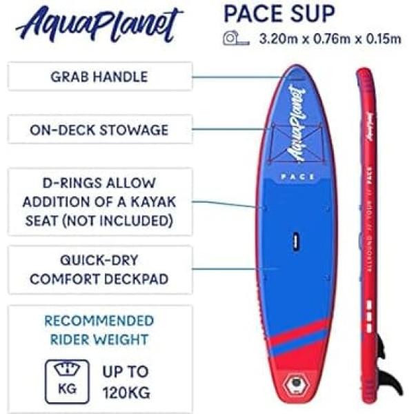 Looking for speed, simplicity and response capacity? The Aquaplanet Pace is suitable for both beginners and advanced users who want a sleek design with a reactive feel. With its characteristic pointed shape, the Pace lets you cut into waves with style; its extra thickness gives you maximum stability and buoyancy. Do you want to get value and comfort from your board? This board ticks all the boxes, with the first-class quality you would expect from Aquaplanet. It is also very comfortable - it can be inflated and ready to use in about 10 hours. What makes the Pace an excellent board? With bright colours and high-quality workmanship, this board will surely attract attention. But it's what lies underneath that counts: ultra-tough drop stitch; thick surface laminate material that allows high PSI inflation; traction pads for grip; triple fins for speed; and a large removable middle fin for stability when paddling. So what exactly is it in the kit? With Aquaplanet, you will find everything you need to start your SUP adventure immediately. Along with your board, you’ll get an adjustable paddle, a safety strap that you can attach to your ankle, a waterproof, dry bag to keep your phone, camera, keys and money safe on the water, a robust backpack for easy transportation, a practical repair kit and, of course, a dual action air pump. - - - › See more product details; Product description A fantastic paddle board kit that comes with everything you need to get up and on the water. Backed by a rock solid 1 year warranty what more could you want! ?; Product description A fantastic paddle board kit that comes with everything you need to get up and on the water. Backed by a rock solid 1 year warranty what more could you want! ?; A fantastic paddle board kit that comes with everything you need to get up and on the water. Backed by a rock solid 1 year warranty what more could you want! ?