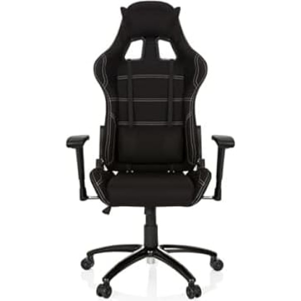 The Game Force offers great lateral support thanks to the strongly pronounced side braces, the high backrest can be individually adjusted in tilt up to an angle of 180° The chair includes two additional cushions that can be attached to the chair in no time at all with flexible rubber bands. One serves as a pillow, the other for support in the lumbar region. The armrests with soft pad support can be adjusted in height and can therefore be adjusted according to your own preferences. The high-quality fabric cover is elaborately quilted and impresses with great attention to detail together with the robust metal base. Dimensions (total height x width x depth): 130-140 x 72 x 63 cm; seat height: 46-56 cm; seat width (usable/full): 37/50 cm; seat depth (usable): 50 cm; armrest height (from seat): 17 - 25 cm; backrest height: 84 cm; maximum load: ): 120 kg; roll size (hard for carpet included): pin diameter 11 mm, roller diameter 50 mm - high-quality hard floor castors to protect your floor can be found from hjh OFFICE ASIN B0045UPF4M › See more product details