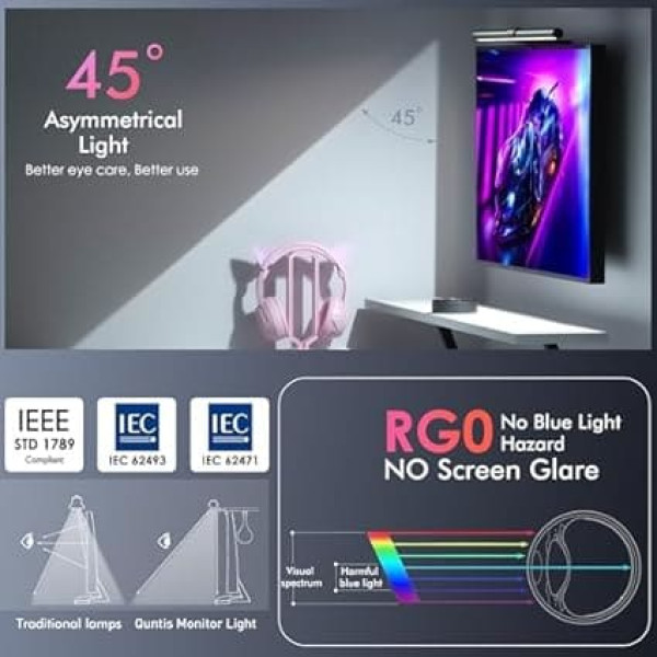 51 cm long 2-in-1 computer monitor lamp: this USB LED desk lamp has two light strips. The front can be used as a monitor light bar to protect your eyes while working and reduce fatigue. On the back there is also an RGB backlight, which also serves as gaming decorative lighting or ambient lighting and allows you an immersive experience when watching movies, listening to music, surfing the Internet or playing games Eye-friendly work lamp on the PC workplace: the LED office lamp on the front has a 45° asymmetrical design as well as a unique lampshade design, which creates flicker-free, blue light-free and even light that illuminates the keyboard and desk area and effectively protects the eyes. With a colour rendering index of 95, the desk lamp makes images appear more vivid and realistic while reducing eye fatigue. Monitor light with wireless control: the buttons of the wireless remote control have a gentle orange backlight, and the power switch remains dimly lit so you can easily find the remote control in the dark. With the remote control, you can turn the front and rear lamps on and off, adjust the brightness and colour temperature of the front lamp and choose the rear light bar between 15 RGB modes (7 single colours, 6 double colours, 2 multi-colours). 【Upgrade patent clamp, suitable for normal/curved/irregular screens】This screen lamp is equipped with an improved adjustable clamp, which not only allows easy and stable installation, but also suitable for different types of screens, including curved and irregular screens. In addition, rubber pads are attached to the places where the monitor light bar touches the monitor so as not to damage the monitor 【Setting】①Middle power button: short press for on/off the front light ②The small power button below: long press for on/off backlight, short press to switch 15 RGB modes ③Short press the side button to adjust the brightness/colour temperature of the front light. By long pressing the buttons to decrease/increase, you can freely adjust brightness (0-100%)/colour temperature (3000K-6000K), while short press allows adjustment in 4 levels. › See more product details