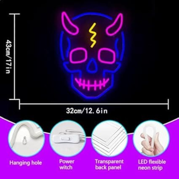 Halloween neon sign: skull neon sign is the ideal eye-catching decoration for Halloween party or home table and your wall. Neon light LED sign add joy and personality to your bedroom and living room and create a playful and slightly creepy atmosphere. USB power supply mode: the LED skull neon sign comes with a 79 inch power cable with switch. This LED neon sign is 42 x 28 cm / 16.5 x 11 inches, and the LED skull neon sign is powered by a USB (connection to PC/charger) connection for easy use. High-quality material: the Halloween neon light consists of coloured, flexible LED strips and an acrylic back board. There is no risk of glass breakage or leakage of dangerous materials. Then you can experience the good mood that the neon sign brings. Easy to use: behind the skull neon light signs there are two holes. Hang neon signs on the wall decoration of your bedroom or place it in the play area of your party to illuminate your celebration. Let the LED neon signs light up your life. Multi-purpose decorative neon lights: Halloween neon sign is often used in the decoration of playrooms, bedrooms, living rooms, children's rooms, bars, shops and hotels. As well as Valentine's Day, weddings, birthday parties, Christmas and other celebrations. LED skull neon signs are also a good choice for giving as a gift. › See more product details