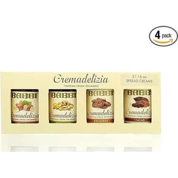 The very fine cream Spalmabili from Babbi are available in an original and elegant gift box with 4 glasses of 150 g cocoa, hazelnut, pistachio and biscokrok. Pack of 4 glasses 150 g › See more product details; Product description The very fine cream Spalmabili from Babbi are available in an original and elegant gift box with 4 glasses of 150 g cocoa, hazelnut, pistachio and biscokrok. A sweet supply whose taste is not easy to forget.; Product description The very fine cream Spalmabili from Babbi are available in an original and elegant gift box with 4 glasses of 150 g cocoa, hazelnut, pistachio and biscokrok. A sweet supply whose taste is not easy to forget.; The very fine cream Spalmabili from Babbi are available in an original and elegant gift box with 4 glasses of 150 g cocoa, hazelnut, pistachio and biscokrok. A sweet supply whose taste is not easy to forget.