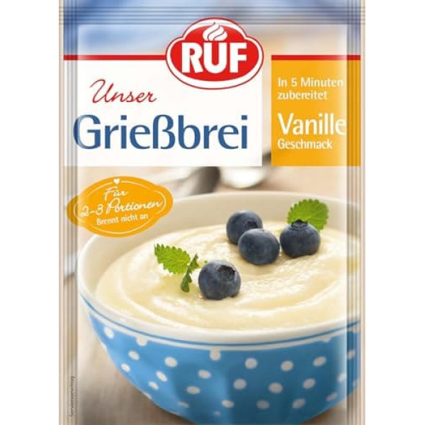 For sweet cats: the vanilla semolina porridge impresses with its easy and quick preparation and can be prepared as a snack, dessert or main course and refined as desired Quick and without burning: in just a few minutes, a delicious dish is conjured up without burning. Simply bring milk to a boil and add the contents of the bag. Let the semolina porridge steep for 5 minutes - done Tastes warm and cold: our semolina porridge based on durum wheat semolina can be refined as desired. Some love it with nuts or dried fruit, the others with fresh berries or fruit grits The baking specialists: with tried and tested RUF products, we offer you, your family and friends desserts and baking products that suit everyone RUF: Make yourself happy! › See more product details; Product description Product Description Semolina porridge as before, but much faster and without burning. Simply stir in boiling milk, let it brew for five minutes and the fresh semolina porridge can be enjoyed hot. And if something is left, the rest also tastes cold. There are no limits to creativity when garnishing: our semolina porridge tastes with fresh fruit, nuts, chocolate sprinkles, applesauce, dried fruit, chia or linseed, cocoa nibs, compote or syrup. Ingredients Ingredients: Hard wheat semolina (45%), sugar, starch, thickener xanthan gum, flavour, colour beta-carotene, emulsifier mono- and diglycerides of fatty acids. May contain traces of nuts, soy, milk and egg. Directions You will still need: 500 ml (1/2 l) milk (1.5% fat). Preparation: 500 ml (1/2 l) of milk to boil. Remove pot from heat. Sprinkle the contents of the bag with a whisk, stirring constantly, and approx. Continue stirring for 1 minute. Do not put the pot back on the hob. Let semolina porridge stand for 5 minutes. Then stir well again and spread on plates. Serve with fruit or compote as desired. Manufacturer Contact Information RUF Lebensmittelwerk KG, Oldenburger Straße 1, D-49610 Quakenbrück See more; Product description Product Description Semolina porridge as before, but much faster and without burning. Simply stir in boiling milk, let it brew for five minutes and the fresh semolina porridge can be enjoyed hot. And if something is left, the rest also tastes cold. There are no limits to creativity when garnishing: our semolina porridge tastes with fresh fruit, nuts, chocolate sprinkles, applesauce, dried fruit, chia or linseed, cocoa nibs, compote or syrup. Ingredients Ingredients: Hard wheat semolina (45%), sugar, starch, thickener xanthan gum, flavour, colour beta-carotene, emulsifier mono- and diglycerides of fatty acids. May contain traces of nuts, soy, milk and egg. Directions You will still need: 500 ml (1/2 l) milk (1.5% fat). Preparation: 500 ml (1/2 l) of milk to boil. Remove pot from heat. Sprinkle the contents of the bag with a whisk, stirring constantly, and approx. Continue stirring for 1 minute. Do not put the pot back on the hob. Let semolina porridge stand for 5 minutes. Then stir well again and spread on plates. Serve with fruit or compote as desired. Manufacturer Contact Information RUF Lebensmittelwerk KG, Oldenburger Straße 1, D-49610 Quakenbrück See more; Product Description Semolina porridge as before, but much faster and without burning. Simply stir in boiling milk, let it brew for five minutes and the fresh semolina porridge can be enjoyed hot. And if something is left, the rest also tastes cold. There are no limits to creativity when garnishing: our semolina porridge tastes with fresh fruit, nuts, chocolate sprinkles, applesauce, dried fruit, chia or linseed, cocoa nibs, compote or syrup. Ingredients Ingredients: Hard wheat semolina (45%), sugar, starch, thickener xanthan gum, flavour, colour beta-carotene, emulsifier mono- and diglycerides of fatty acids. May contain traces of nuts, soy, milk and egg. Directions You will still need: 500 ml (1/2 l) milk (1.5% fat). Preparation: 500 ml (1/2 l) of milk to boil. Remove pot from heat. Sprinkle the contents of the bag with a whisk, stirring constantly, and approx. Continue stirring for 1 minute. Do not put the pot back on the hob. Let semolina porridge stand for 5 minutes. Then stir well again and spread on plates. Serve with fruit or compote as desired. Manufacturer Contact Information RUF Lebensmittelwerk KG, Oldenburger Straße 1, D-49610 Quakenbrück See more