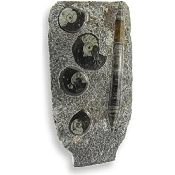 You will receive the pictured plate with Orthoceras fossils (petrified squid) from Budawi Mother rock: granite rock roughly hewn Origin: Morocco Dimensions: height approx. 40 cm. Width: approx. 21 cm. Thickness: approx. 2.5 - 3 cm. Weight: approx. : 4.1 kg There are approx. 5-7 hours processing time necessary to knock a cephalopod from the surrounding mother rock freely. More fossils can be found in our shop › See more product details; Product description Orthocerase plate with base of Budawi; Product description Orthocerase plate with base of Budawi; Orthocerase plate with base of Budawi