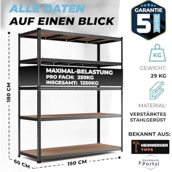 UP TO 1250 KG LOAD - With 3 centre supports and high quality aluminium, the shelf provides maximum stability for heavy loads - ideal for warehouse, garage and workshop. HEIGHT ADJUSTABLE BASES - Flexibly adjustable for any type of storage goods - from tools to bulky items. Perfect for all needs. Easy assembly without tools: thanks to the innovative plug-in system can be set up in minutes - saves time and effort. Floor-friendly and safe: rubber feet protect sensitive floors from scratches and ensure a non-slip stand, even under maximum load. MULTIPURPOSE - Whether it's a basement, garage, warehouse or workshop - our heavy duty shelf creates space anywhere and ensures perfect order. DURABLE & STURDY - The shelf is made of high quality aluminium that can withstand even the toughest conditions. Thanks to its powder coating, it is extremely durable, rust-proof and particularly durable. › See more product details
