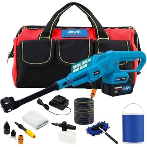 Portable design: this battery-operated pressure washer is lightweight and portable. Its compact size allows for easy transport and storage. It also comes with a folding bucket and a weighted mesh filter that won't float on the water, making this set ideal for cleaning tasks on the go. Take it anywhere to clean your home, car, boat or garden with ease. Powerful cleaning: The pressure washer can withstand a maximum pressure of 750 psi, with the operating water pressure up to 350 psi, which ensures robust and efficient cleaning of your outdoor areas and devices. Its water flow is 3.3L/min and delivers significant power for your daily outdoor cleaning needs. Long-lasting battery power: Equipped with jovant 20 V 4.0 Ah battery, this battery pressure washer offers long-lasting performance and reliable performance. Equipped with 3-in-1 cleaning brush, this kit is specially designed for cleaning vehicles such as cars and boats. 【Versatile Cleaning】Our pressure washer comes with 2 nozzles: 6-in-1 spray nozzle, which provides 0°, 15°, 25°, 40°, fan-shaped and shower mode options; Duckbill nozzle by rotating the nozzle, adjust the distance between the plates to create a water flow that goes from a straight stream to a fan-shaped mist. Whether high or low pressure cleaning or detergent, these will meet most of your needs. Clean cars, bicycles, swimming pools, windows, driveways, garden plants and much more. Useful accessories: this car water gun is perfect for a variety of cleaning tasks for vehicle, home and garden. It comes with several accessories to meet your needs: 1* 6-in-1 nozzle, 1* duck snail nozzle, 1* 4.0Ah battery, 1* charger, 2* hose quick connector, 1* faucet quick connector, 1*16ft 1/2in inlet water hose, 1* foam pot, 1* water filter, 1* 3-in-1 retractable cleaning tool, 1* cotton cleaning 1* 12 inch 13L folding bucket, 1 x user manual (English language not guaranteed), 1 x storage › See more product details