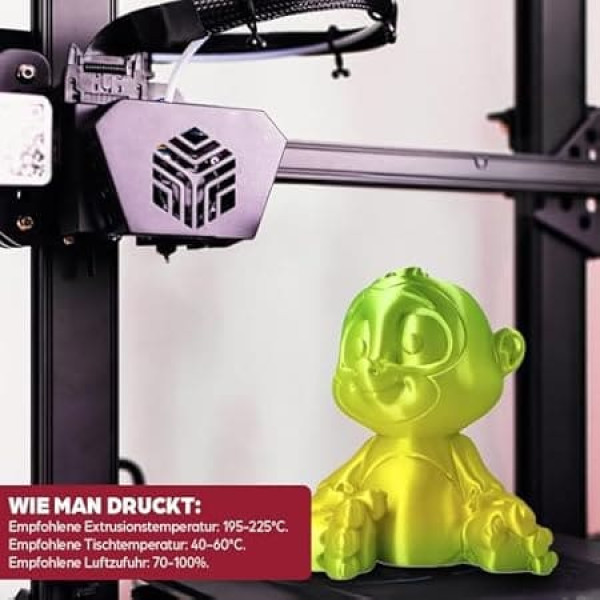 Unique Gradients Each spool PLA multicolour filament contains multiple colors in rich green tones and cheerful Brazilian yellow that blend seamlessly into each other, adding a unique character to each 3D print. It has a glossy surface, reflects the light beautifully and gives the prints a visual softness. 1 colour cycle weighs only 170g. High print quality: Thanks to the low shrinkage and excellent interlayer adhesion, you can expect detailed prints with excellent accuracy. Odourless and user-friendly: PLA Multicolour is odourless and easy to print, ideal for use on simple printers without a heated build platform. MULTIPLE USES Perfect for decorations, toys, gadgets and personalized gifts, adding color and creativity to your projects. Printing Parameters The filament can be printed on unheated tables. If you have any problems with adhesion, we recommend using a bonding agent. Recommended extrusion temperature: 195-225°C. Recommended table temperature: 40-60°C. Recommended air supply: 50-100%. If there are problems with the gloss, we recommend increasing the temperature or reducing the speed when contouring. › See more product details