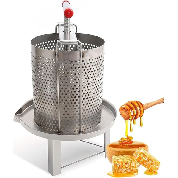 EFFORTLESSLY EXTRACT HONEY & BEESWAX: This manual honey press extractor is equipped with a perfectly sized nozzle for optimal honey extraction, ensuring a smooth and efficient process without any wastage or splashing, enabling maximum preservation of honey. Durable stainless steel construction: made entirely of stainless steel, this honey extractor is highly resistant to corrosion and erosion, ensuring a long service life. Easy to clean and disinfect, it offers excellent hygienic performance. Thoughtful design details: the evenly arranged mesh and sturdy stainless steel beams result in efficient honey production. The triangular base provides stability and durability, making this extractor a reliable tool for beekeepers. Versatile and convenient: Designed for quick and convenient honey extraction, this extractor is suitable for bee farms of all sizes as well as for home, restaurant, and commercial use, making it an essential tool for any beekeeper. › See more product details; Product description · Efficiently extract honey without causing any splashing. T-shaped handle ensures easy and effortless squeezing. Versatile 2-in-1 machine for pressing honey and beeswax. Made of durable stainless steel for long-lasting corrosion resistance. Essential equipment for beekeepers to streamline their work. Premium stainless steel honey extractor: Dimensions: barrel diameter: 23 cm, height: 27 cm, volume: 12 L. Specifications: Straight or Curled Edge for versatile use in honey extraction. Ideal for extracting honey and beeswax with ease. -Package includes: 1 x stainless steel honey extractor. 3 x filter bags. - Instructions for use: 1. Divide honeycomb honey block and place it into the filter bag. Insert drain plate into honey press bucket, followed by filter bag with honeycomb. Secure pressure rod and thickened pressure disc for extraction. 2. Melt solid beeswax in an iron pot until liquefied, then pour into machine for pressing. Please note: Due to manual crafting, product may exhibit slight welding points.; Product description · Efficiently extract honey without causing any splashing. T-shaped handle ensures easy and effortless squeezing. Versatile 2-in-1 machine for pressing honey and beeswax. Made of durable stainless steel for long-lasting corrosion resistance. Essential equipment for beekeepers to streamline their work. Premium stainless steel honey extractor: Dimensions: barrel diameter: 23 cm, height: 27 cm, volume: 12 L. Specifications: Straight or Curled Edge for versatile use in honey extraction. Ideal for extracting honey and beeswax with ease. -Package includes: 1 x stainless steel honey extractor. 3 x filter bags. - Instructions for use: 1. Divide honeycomb honey block and place it into the filter bag. Insert drain plate into honey press bucket, followed by filter bag with honeycomb. Secure pressure rod and thickened pressure disc for extraction. 2. Melt solid beeswax in an iron pot until liquefied, then pour into machine for pressing. Please note: Due to manual crafting, product may exhibit slight welding points.; · Efficiently extract honey without causing any splashing. T-shaped handle ensures easy and effortless squeezing. Versatile 2-in-1 machine for pressing honey and beeswax. Made of durable stainless steel for long-lasting corrosion resistance. Essential equipment for beekeepers to streamline their work. Premium stainless steel honey extractor: Dimensions: barrel diameter: 23 cm, height: 27 cm, volume: 12 L. Specifications: Straight or Curled Edge for versatile use in honey extraction. Ideal for extracting honey and beeswax with ease. -Package includes: 1 x stainless steel honey extractor. 3 x filter bags. - Instructions for use: 1. Divide honeycomb honey block and place it into the filter bag. Insert drain plate into honey press bucket, followed by filter bag with honeycomb. Secure pressure rod and thickened pressure disc for extraction. 2. Melt solid beeswax in an iron pot until liquefied, then pour into machine for pressing. Please note: Due to manual crafting, product may exhibit slight welding points.