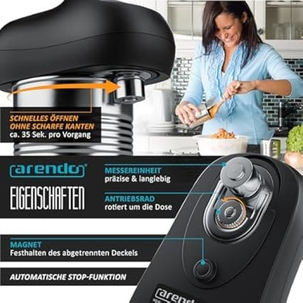 Practical and hygienic. With just a push of a button, the electric can opener opens your canned food in no time at all. A magnet then holds the separated lid firmly. Ideal for easy and hygienic removal. Suitable for all standard cans without flap. | 306221 One touch operation. Simply place the ergonomically shaped device on the can and press the large start button. When cutting, the can opener rotates once in a circle and stops automatically as soon as the can is opened Safe, precise and clean. The blade cuts exactly along the can side without leaving sharp edges or coming into contact with the food contained. Compact and wireless. Can be used throughout the kitchen and stored in a drawer to save space. Clean with a damp cloth (please do not immerse the device in water). | The can opener uses 4 AA batteries (included). Dimensions: 12 x 7 x 6.5 cm. Weight: 226 g. Box contents: Arendo electric can opener with quick start guide and batteries › See more product details