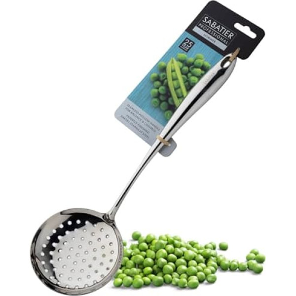 MASTER THE ART OF COOKING Effortlessly separate scalding oil or sparkling water with this essential kitchen companion. Unlike flimsy plastic alternatives, our skimmer can withstand the test of heat and never succumb to sizzling. Smooth scooping and draining with precision, leaving only culinary perfection. Sometimes only a big skimmer does the job. SHINY ENOUGH TO SEE YOUR FACE Experience culinary skills like never before with our carefully crafted kitchen tool series. Made from premium SAE201 stainless steel, these kitchen wonders guarantee unwavering durability to ensure they outlast any competition. Their smooth, highly polished finish not only exudes elegance, but also resists dirt, making cleaning in your dishwasher a breeze. CHOICE FOR PROFESSIONALS WORLD-WIDE Thanks to excellent quality, unsurpassed performance, ease of use, effortless cleaning, durability and longevity. Sabatier is over 150 years old, with its roots in Thiers, France. This is a lot of experience in the production of kitchen utensils. Trust in the Sabatier Professional Mirror-Polished Series. Available tools: solid turner, spaghetti server, skimmer, serving spoon, slotted turner and ladle. EASY SERVING: Kitchen life is easier when you have the right tool for the task. A lot of time and effort, trial and error has been put into the most perfect series yet. Each has strong, hardened stainless steel construction handles. The roundness feels smooth and comfortable in the hand. The carefully weighted handles ensure a good balance so your hand is not tired of repetitive kitchen tasks. The clever design has loops at the ends of the handles that fit all storage options. DISHWASHER SAFE: Here at Sabatier we want to add elegance to your kitchen, but also make your life as easy as possible. That's why all tools available in this series are completely safe to clean in the dishwasher. They are just as easy to clean by hand as they are made of non-stick stainless steel. Enjoy the lightness, elegance and lasting quality that distinguishes this tool. Buy now and enjoy every moment of the meal! › See more product details