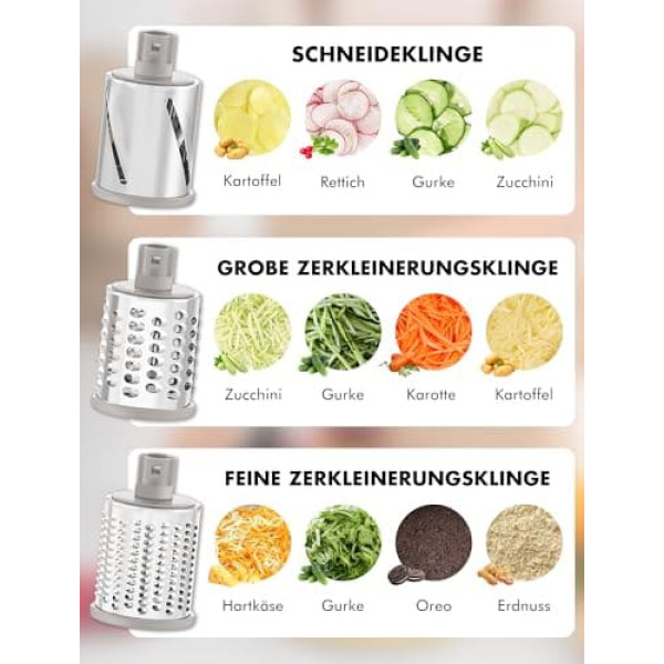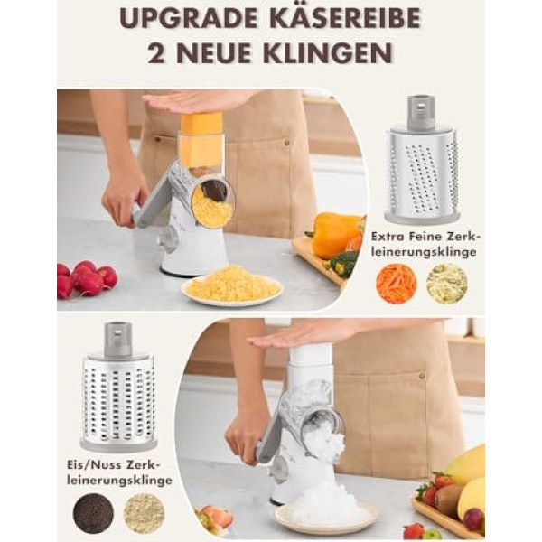 5 in 1: The improved cheese grater from GDL can not only grate, cut and crush, but also features two new blades to crush ice for smoothies and grind nuts for desserts finer. A single kitchen appliance with different functions! Reduces kitchen tool needs. A TIME SAVING HELPER The drum blade of the vegetable slicer cuts continuously, so it grates ingredients 12 times faster than other cheese graters with crank, which shortens preparation time and delivers consistent results. Makes kitchen work more convenient and efficient. High Quality Materials The components of the vegetable slicer are made of ABS material, which meets food safety standards and does not contain BPA. The stainless steel blades are rust-proof and durable and remain intact even with frequent use. User Friendly Design This drum grater is equipped with a powerful suction cup, which can be fixed on a clean or smooth marble countertop to ensure stability during use. The hand crank design and pusher keep you away from the blade during operation, which is safer than conventional cheese graters. No cleaning worries: all parts of the vegetable grater can be easily disassembled. The kitchen grater can not only be washed by hand, but is also dishwasher safe on the top rack of the dishwasher. No more problems with cleaning and scrubbing. KITCHENWARE EXPERT BY YOUR SIDE Our cheese grater package includes comprehensive instructions. Even if you are a beginner, you can operate the vegetable grater manually without any worries. We offer 1 year warranty. We also offer 24-hour customer service and lifetime technical support. › See more product details
