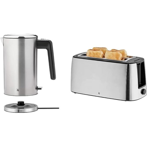 Product 1: Contents: 1x stainless steel kettle made of Cromargan stainless steel matt (26.2 x 23.4 x 14.2 cm, volume min. 0.5 - 1.3 litres, 2400 W, cable length 1 m), 1 x device base including cable reel. Item number: 0413210011 Product 1: Safety touch: housing under the handle can be touched during cooking Product 1: High safety thanks to dry running and overheating protection, automatic boiling stop and lid lock Product 1: Concealed stainless steel heating element. Internal water level indicator. Comfort one-handed lid opening at the touch of a button Product 2: Contents: 1x double long slot toaster made of Cromargan stainless steel matt (39 x 18.4 x 19.5 cm, 1550 watts, cable length 1 m) - item number: 0414150011 Product 2: Suitable for 2 x 2 slices of toast (up to a size of 12 x 12 cm), long slices of bread, yeast braid and similar baked goods with a maximum thickness of 2.6 cm Product 2: 6 variably adjustable browning levels thanks to control: toast can be toasted from only very light to strong, dark browned depending on the taste Product 2: Defrosting function for frozen bread, aftertoast/crisper function for already cooled toast or rolls from the previous day. Thanks to the stop button, toasting can be interrupted at any time › See more product details