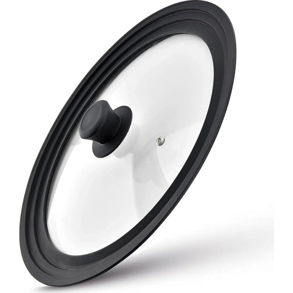 Universal Glass Lid fitted with a stepped silicone rim Suitable for pot/frying pan diameter 16, 18, 20 cm and diameter 24, 26, 28 cm Silicone base for a little heat loss whilst cooking and protects pots/pans against scratches Steam hole for pressure equalisation and minimises the risk of the over cooking with transparent lid to see what you're cooking, stay cool silicone handle protects hand from burning Oven-safe up to 230 °C and dishwasher-safe › See more product details