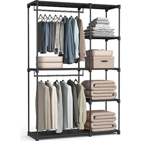 [Plenty of Storage Space] This 43 x 124 x 182 cm cabinet offers enough space - 2 compartments for hanging clothes and multiple shelves for folded clothes. You can also remove the medium large shelf to get a large hanging compartment Robust and stable: The standing shelf supported by reinforced metal tubes and plastic connectors is stable and good load capacity - each fabric shelf can hold up to 10 kg and each clothes rail can hold up to 15 kg Versatile: Thanks to the simple design, this clothes rack can be easily integrated into your home and fits perfectly into the bedroom, living room, hallway or pantry [Easy Assembly] No tools are required to assemble this coat rack. Thanks to the clear instructions (English language not guaranteed) and the marked parts, this coat rack can be set up in an instant [Included tilt protection] With the included tilt protection, you can attach this open wardrobe to the wall and thus create a safe environment › See more product details