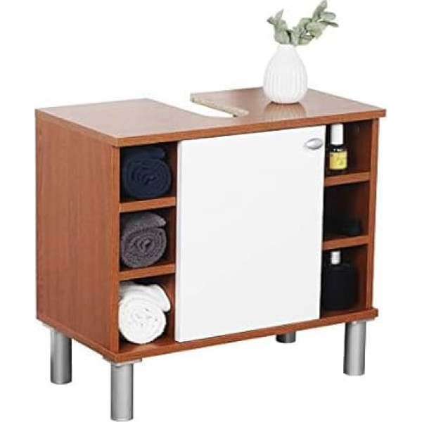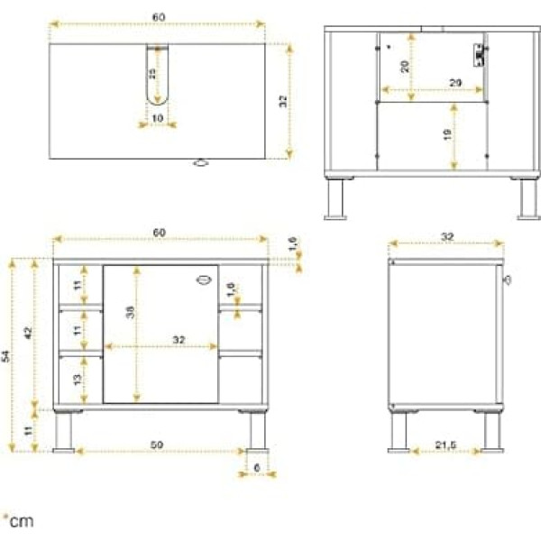 Description: Dimensions mini sink cabinet standing assembled 60 cm wide, 54 cm high, 32 cm deep. Siphon cut-out 10 x 25 cm. With rear panel and 1 door. 2 shelves per side Use: this design bathroom shelf looks modern and is suitable in the guest toilet, toilet as a wash chest of drawers or vanity unit, as it is small and narrow Use: the organiser storage space is versatile for storing accessories such as combs, hair dryers, straighteners, razors, towels, toilet paper and more ORGANIZATION: Space-saving storage of utensils such as perfume after shave deodorant dorant shampoo shower gel detergent toothbrushes soap cream side organiser compartments open Important: durable sturdy chipboard made of compressed wood. Wooden furniture for indoor use only. Not suitable for outdoor use. No wall cabinet / no wall mounting / not for hanging. Includes practical siphon cut-out › See more product details
