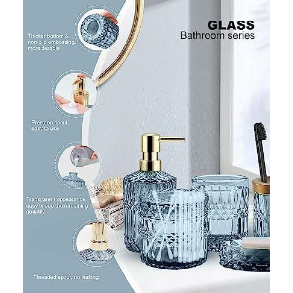 【Excellent Quality】: Our 5-piece glass bathroom accessories include a lotion dispenser, soap box, toothbrush holder, glass cup and cotton swab bottle. These products are made of high quality glass material, thick and durable, not easy to break or pour, and not easy to mould, even in damp environment. 【Multifunctional】: Our bathroom organiser 5 pieces can be used to hold hand soap, detergent, lotion, aromatherapy essential oil blends, shampoo, body wash, mouthwash, hand sanitizer, massage oil, etc. The toothbrush holder is suitable for most sizes of electric toothbrushes, toothbrushes, toothpaste tubes, flossers and razors. 【Fashionable & Beautiful】: our bathroom set can keep your bathroom tidy and organized, you can put these items together on your bathroom countertop or use them individually, it is also a vibrant and stylish decoration for monotonous ordinary bathrooms, easy to match with different styles of bathrooms. 【Reusable】: the advantage of this glass material is easy to keep clean, not easy to rust, very easy to clean, just use detergent or water to make it new, very convenient, save time and effort, add simple texture style for your bathroom. 【Great Gift Choice】: the bathroom accessories is also a great addition to your bathroom decor while storing your toiletries, perfect as a wedding gift, housewarming gift, new house gift, birthday gift, Mother's Day gift, Valentine's Day gift, Thanksgiving gift, Christmas gift, bridal or baby shower gift, suitable for people of all ages. › See more product details